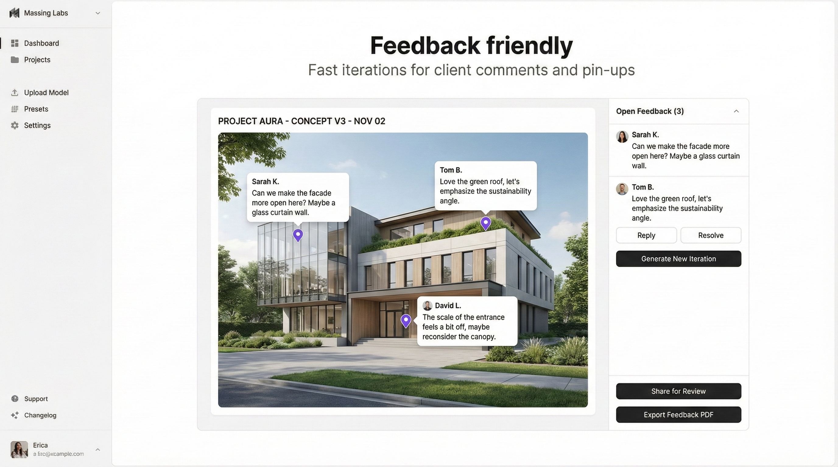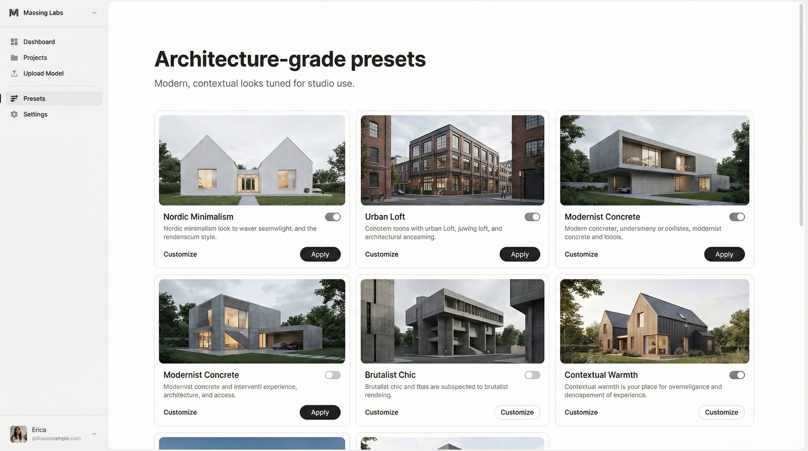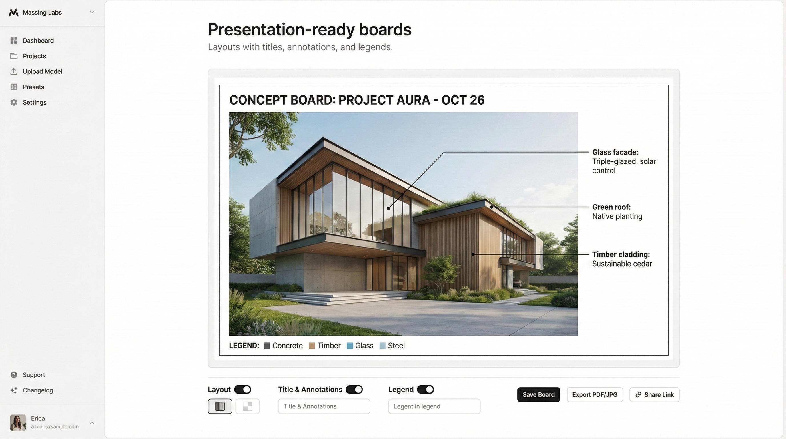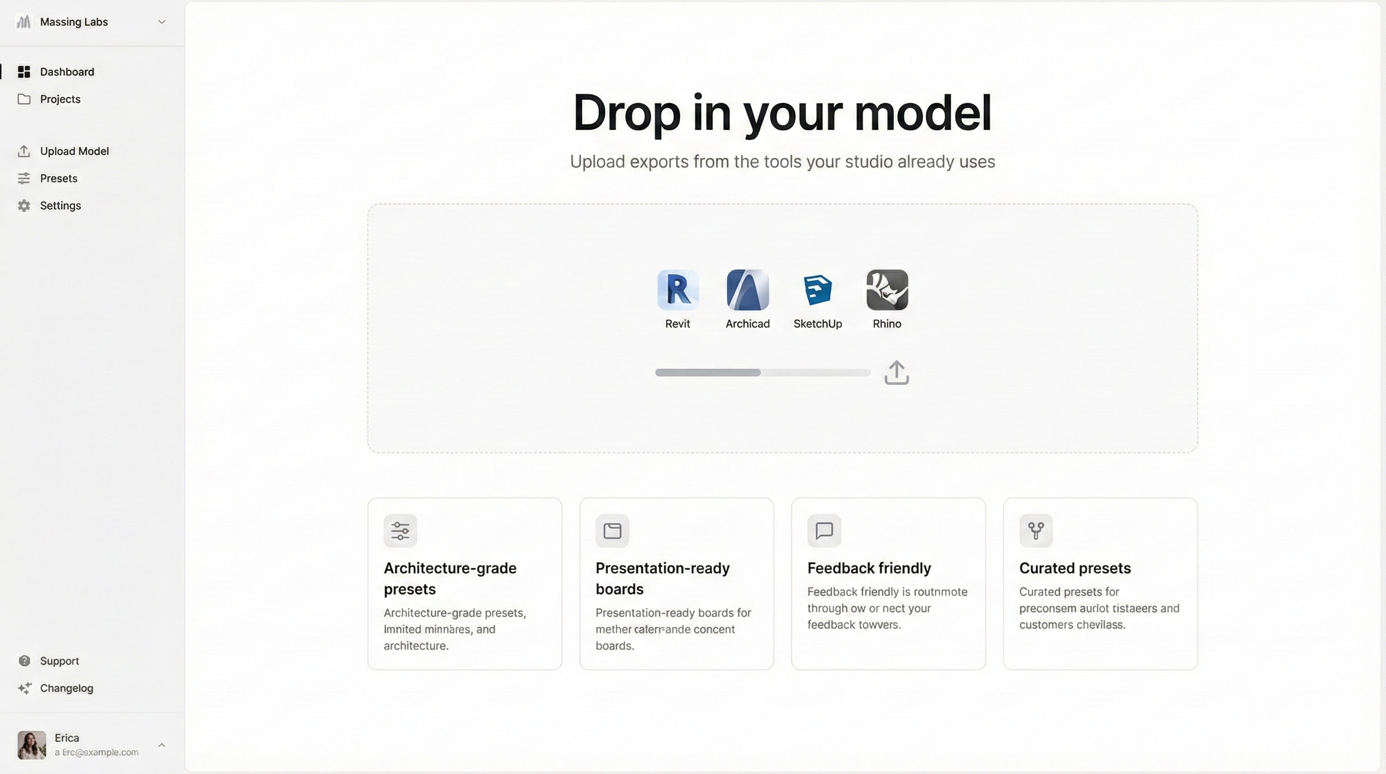 Massing Labs turns simple white-box exports from Revit, Archicad, SketchUp, or Rhino into presentation-ready visuals your clients can react to—without leaving your workflow.